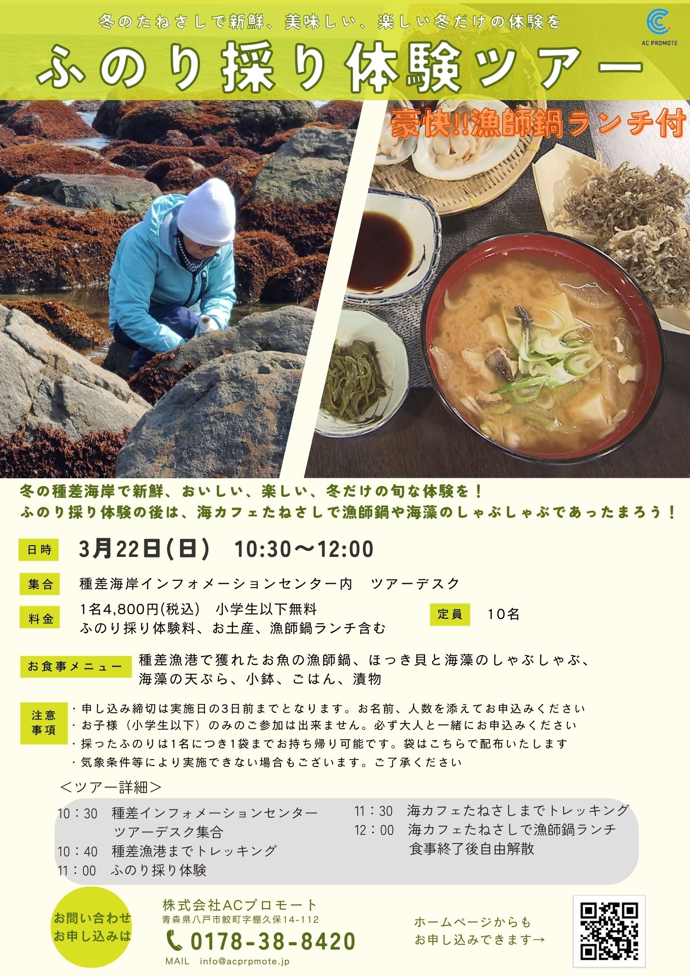| ツアー内容 | 10:30種差海岸インフォメーションセンターツアーデスク集合 → 10:40種差漁港までトレッキング → 11:00ふのり採り体験 → 11:30海カフェたねさしまでトレッキング → 12:00漁師鍋ランチ → 食事終了後自由解散 | 注意事項 | ※申し込み締め切りは3日前までとなります ※お子様(小学生以下)のみのご参加は出来ません。必ず大人と一緒にお申込みください ※採ったふのりは1名につき1袋までお持ち帰り可能です。袋はこちらで配布いたします ※気象条件により実施できない場合もございます。ご了承ください |