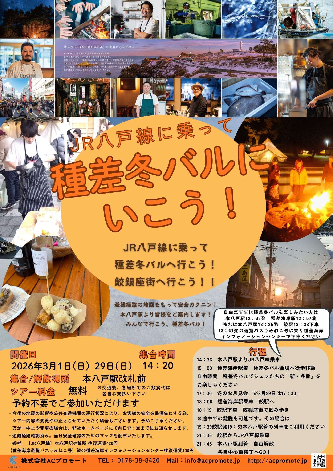 | お知らせ | ・今後の地震の影響や公共交通機関の運行状況により、お客様の安全を最優先とする為、ツアー内容の変更や中止とさせていただく場合もございます。予めご了承ください。 万が一中止や変更の場合は、ホームページにて前日17:00までにお知らせします。 ・避難経路確認済み。当日は安全確認のためにマップを配布いたします。 ・参考 【JR八戸線】本八戸駅⇔鮫駅 往復運賃420円 【種差海岸遊覧バスうみねこ号】鮫⇔種差海岸インフォメーションセンター往復運賃400円 |